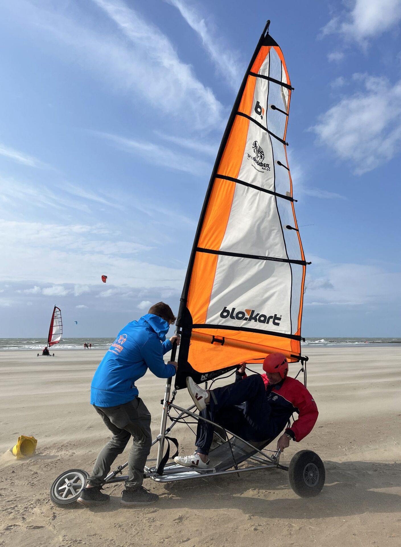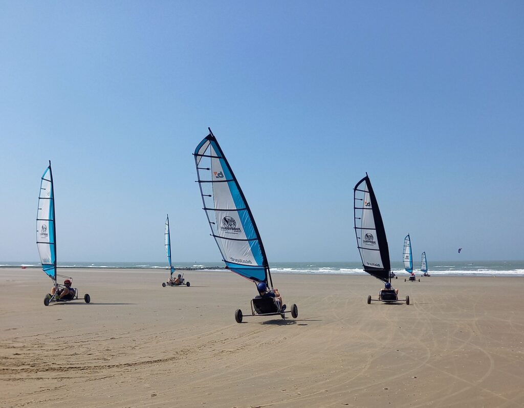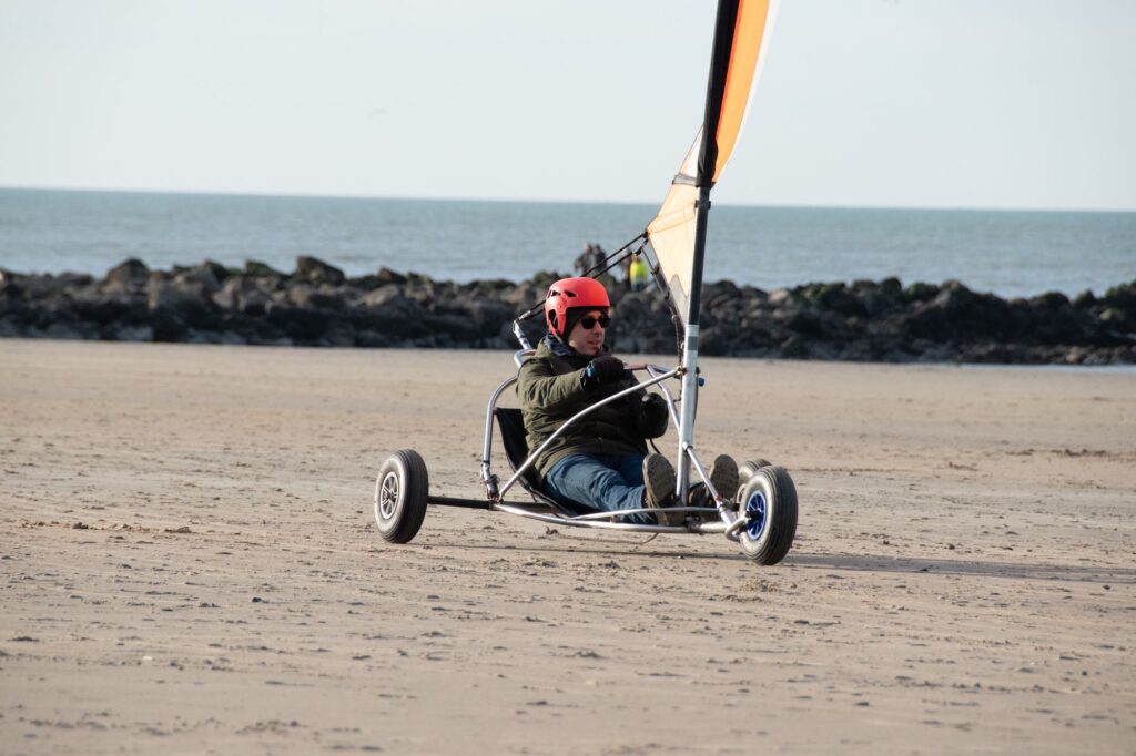 Blokarten – ook wel zeilwagenrijden genoemd – is pure actie op het strand. In een driewielige kar, aangedreven door de kracht van de wind, scheer je laag over het zand. Door het zeil aan te spannen, bepaal je zelf je snelheid. Dankzij de lage zithouding voelt elke rit als een spectaculaire adrenalinerush.